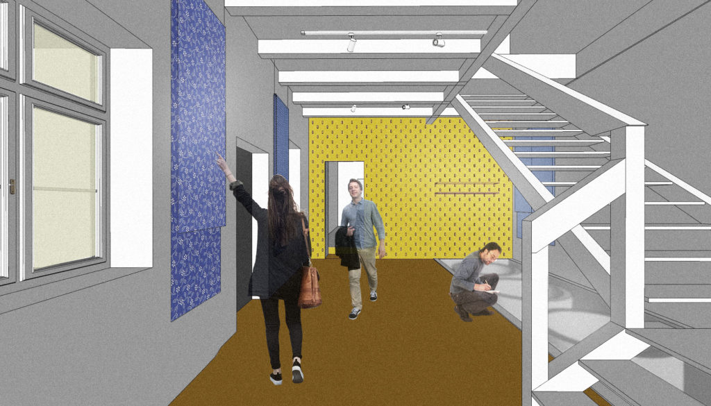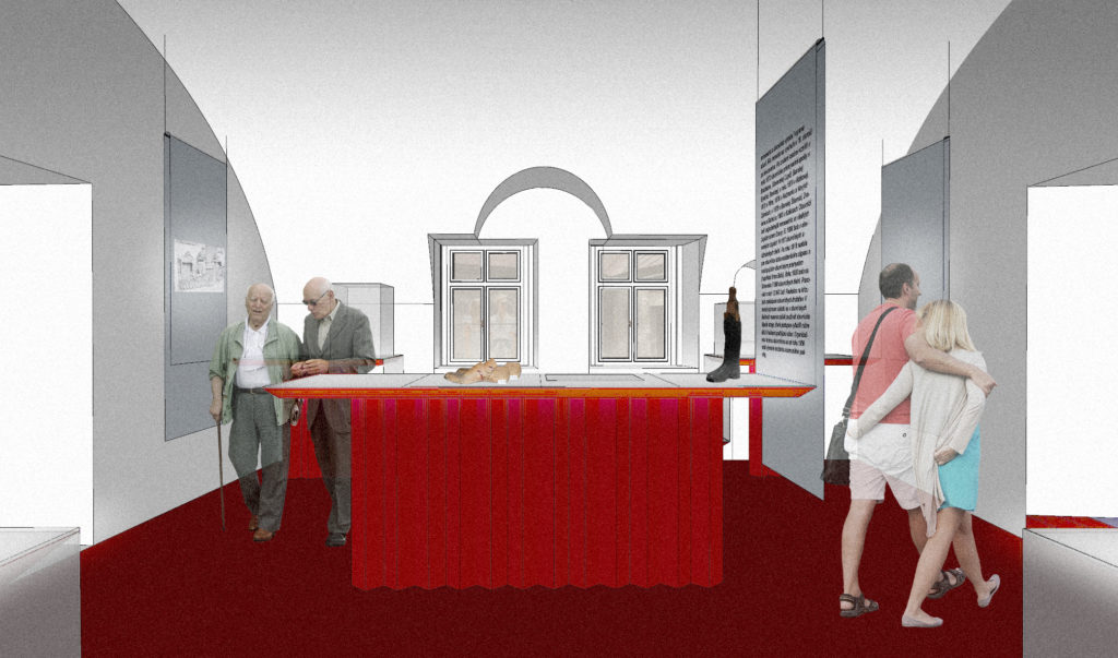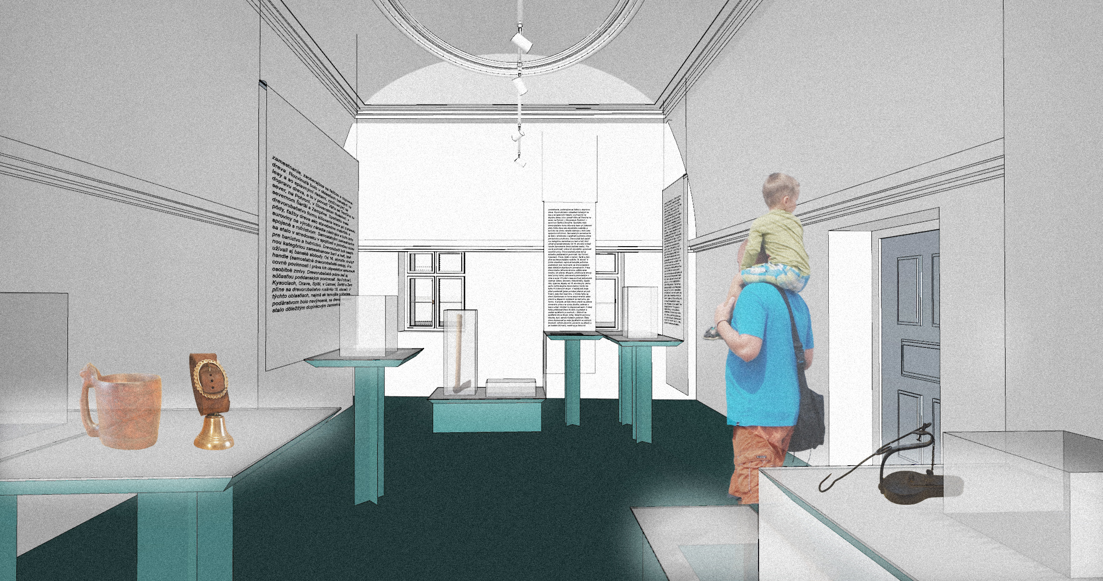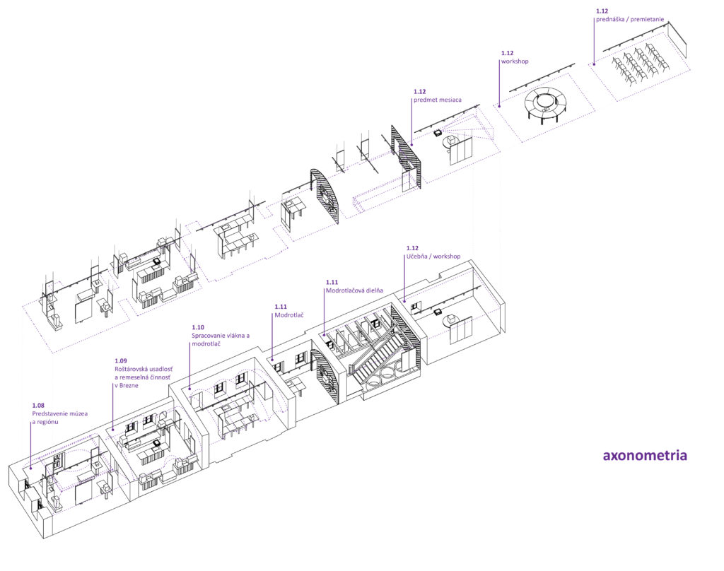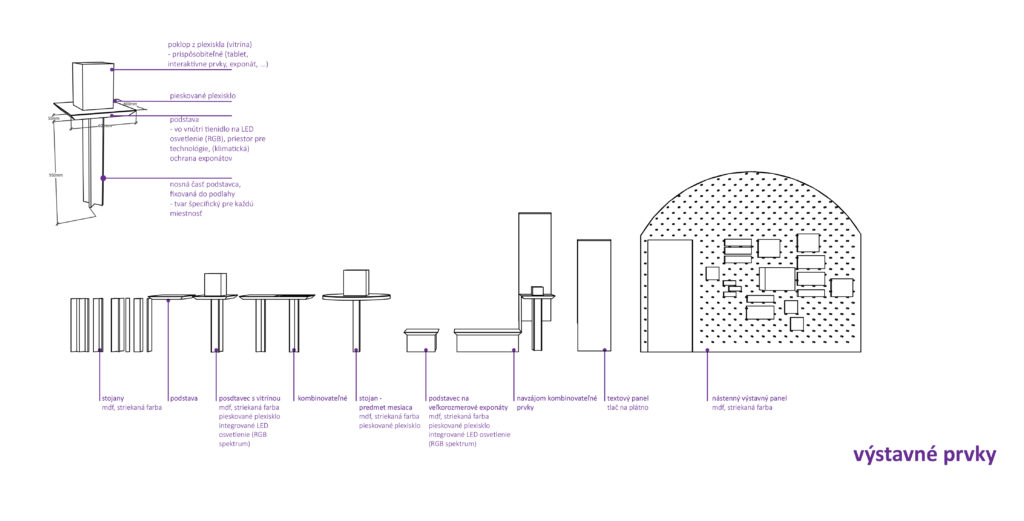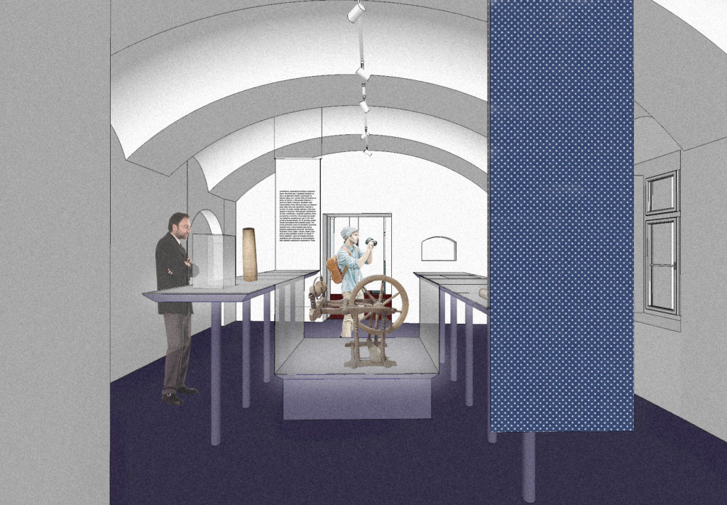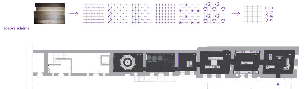 Výtvarná koncepcia expozície je inšpirovaná vzormi z modrotlačových foriem. Na základe grafickej redukcie týchto vzorov sa extrahovali dva základné princípy – pravidelný raster a sedem geometrických útvarov. Tieto princípy sa následne aplikovali pri tvorbe expozície. Textové panely sú inšpirované namáčaným modrotlačovým plátnom.